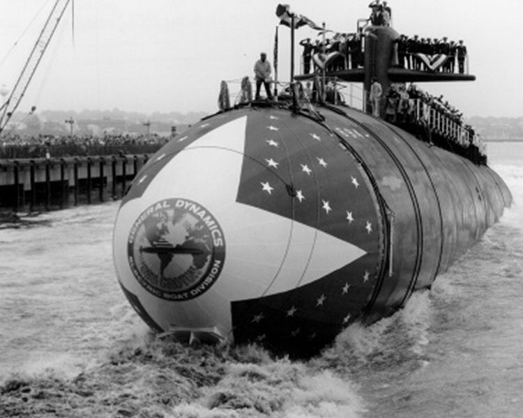 69k | Into the Thames River, the Groton (SSN-694) starts to get wet at her launching at the Electric Boat Div. of General Dynamics Corp., Groton, CT., 9 October 1976. | Courtesy of USNI. | |
