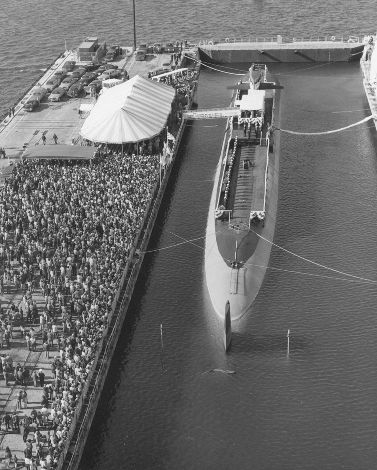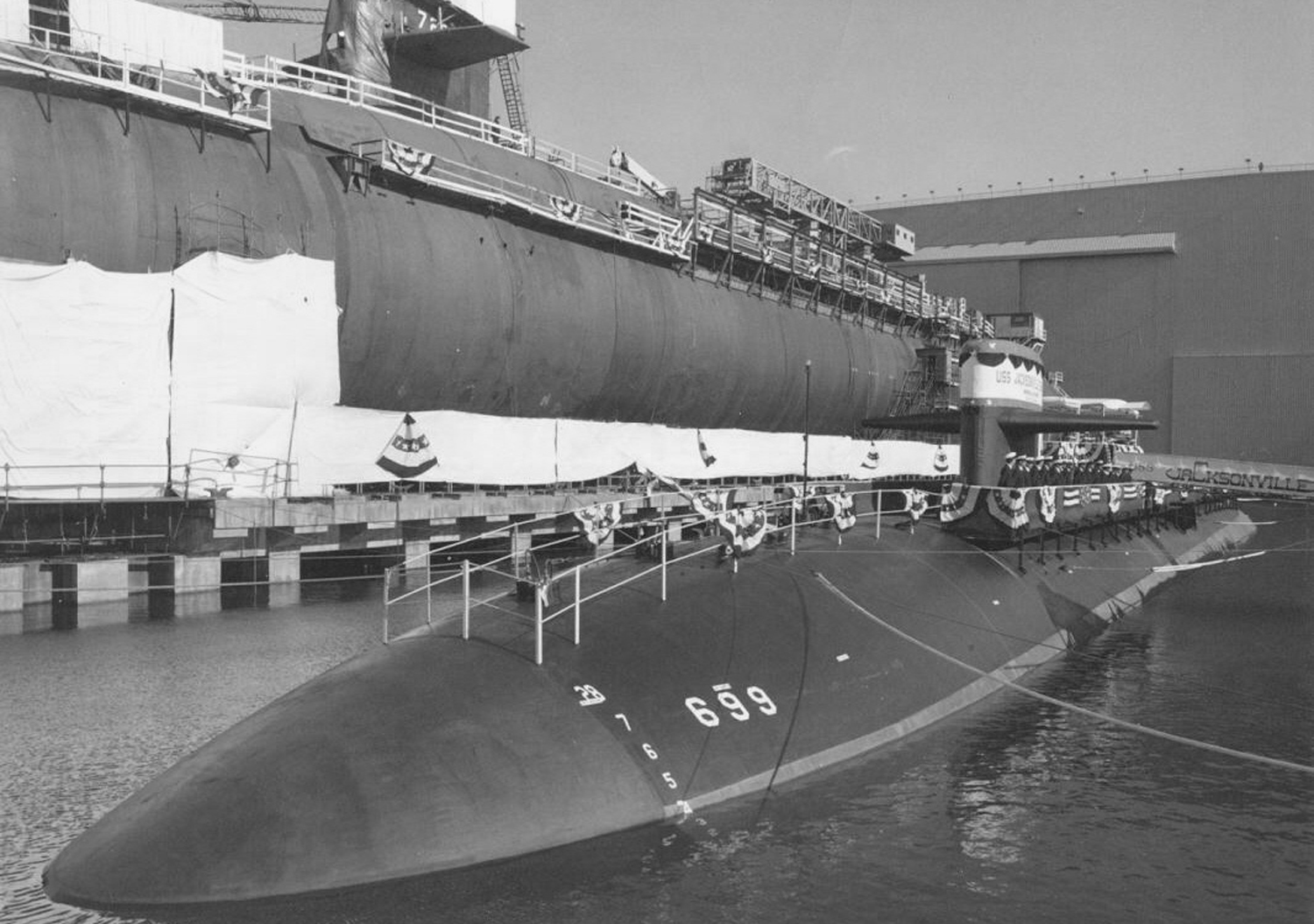 ![]() | 582k | Launching ceremony of the Jacksonville (SSN-699), at the Electric Boat Division of General Dynamics Corp building piers at Groton, CT., November 1978. The Ohio (SSBN-726) is alongside. | Courtesy of John Hummel, USN (Retired). | |