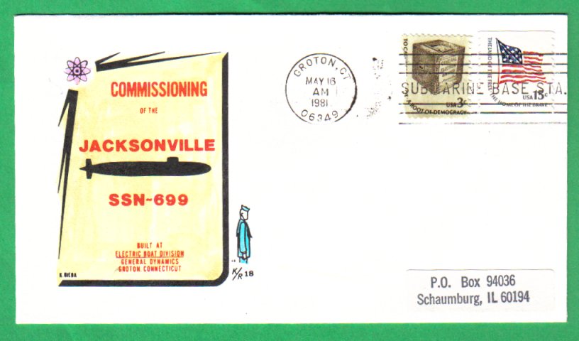 ![]() | 54k | Commemorative post mark honoring the commissioning of the Jacksonville (SSN-699), 16 May 1981. | Courtesy of Jack Treutle (of blessed memory). | |