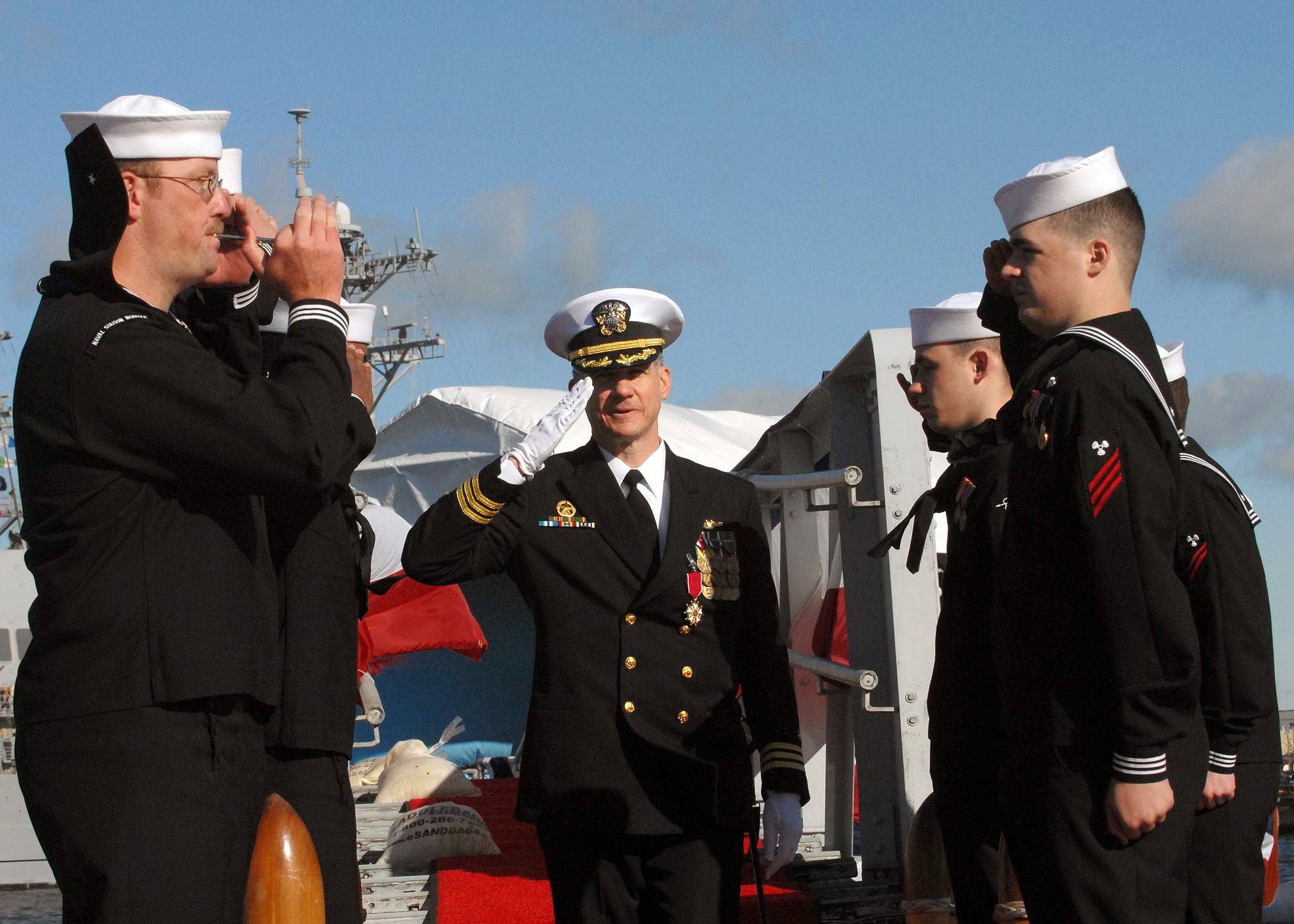 ![]() | 250k | Cmdr. John Kropcho III departs the attack submarine Jacksonville (SSN-699) on 12 December 2008 at the end of his 24-year Navy career. Kropcho is relieved as Jacksonville's commanding officer by Cmdr. Tyler Meador during a combined change of command and retirement ceremony aboard the boat at Naval Station Norfolk. | U.S Navy photo # N-7668G-071 by Mass Communication Specialist 2nd Class Xander Gamble, courtesy of news.navy.mil. via Bill Gonyo. | |