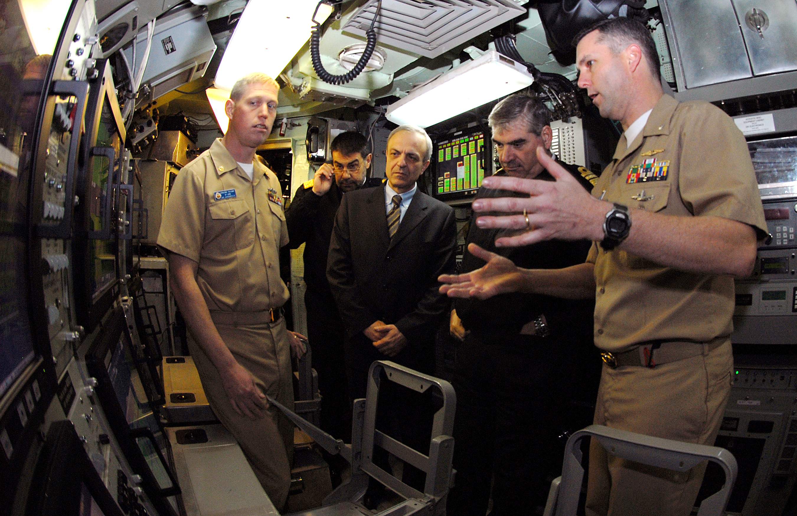 ![]() | 338k | U.S. Navy Cmdr. Tyler Meador, right, commanding officer of attack submarine Jacksonville (SSN-699), describes sonar room operations to Greek navy Vice Adm. Georgios Karamalikis, Chief of Hellenic Navy General Staff, 24 February 2009, in Norfolk, Va. Karamalikis is visiting the Norfolk area as an official guest of the U.S. Chief of Naval Operations. | U.S Navy photo # N-7705S-046 by Mass Communication Specialist 1st Class Todd A. Schaffer courtesy of Bill Gonyo. | |