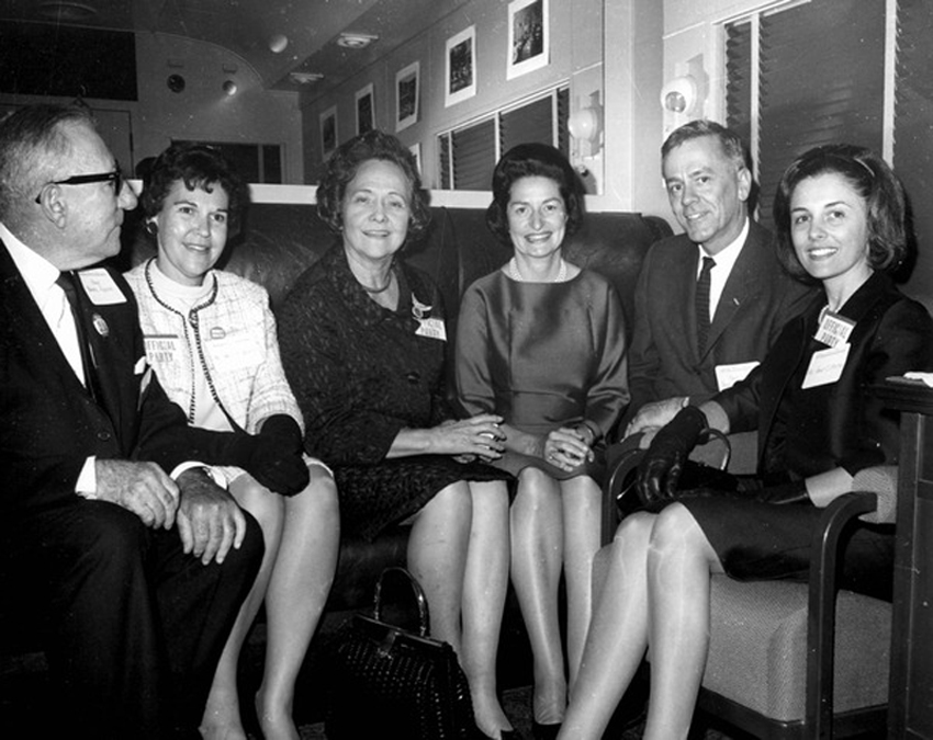 283k | First Lady Lady Bird Johnson and others aboard a campaign train. The Jacksonville (SSN-699) was sponsored by Mrs. Dorothy Jean Bennett, wife of Congressman Charles Bennett. Pastor of Riverside Avenue Christian Church, the Rev. Fred Woolsey, recalled one of the Bennett's more lasting marks on America — a bill he sponsored in 1954 adding the words "In God We Trust"to the nation's coins and currency. "He did not do that because he saw popularity. It was done because he believed that trust in God is the vital basis of life. It was the motto of his life and the source of his own faith,"the Rev. Fred Woolsey said during the service. Photographed on 8 October 1964. L-R: Congressman Claude Pepper, Mrs. Charles Bennett, Mildred Pepper, Lady Bird Johnson, Congressman Charles Bennett, and ?. |