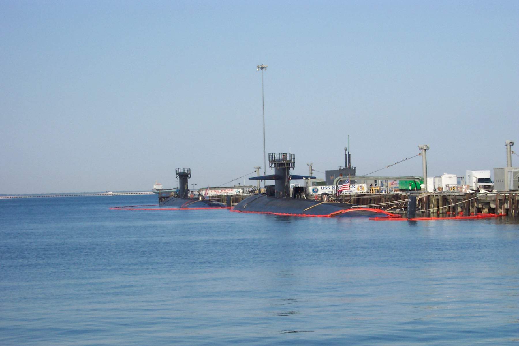 ![]() | 927k | An aerial view of a section of the Naval Station showing destroyer and submarine (D&S) pier #21. On the south side of the pier is the submarine tender Emory S. Land (AS-39) with four Los Angeles class nuclear-powered attack submarines moored on the north side including the Atlanta (SSN-712), Jacksonville (SSN-699), and unidentified sub, and Hampton (SSN-767), 25 June 1995. | Defense Visual Information Center photo # DN-SC-95-02165, by Robert J. Sitar, from the Department of Defense Still Media Collection, courtesy of dodmedia.osd.mil. | |