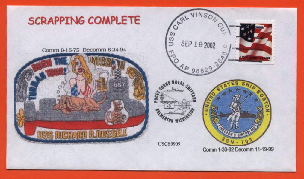 ![]() | 70k | Commemorative post mark on the occasion of Richard B. Russell (SSN-687) & Boston (SSN-703) after finishing the NPSSRP (Nuclear Powered Ship and Submarine Recycling Program), September 2002. | Courtesy of Jack Treutle (of blessed memory). | |