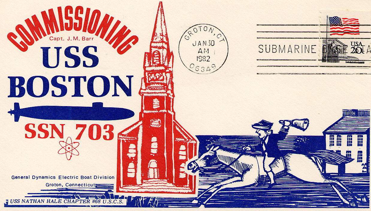 ![]() | 2.12k | Commemorative postal cover marking the commissioning of the Boston (SSN-703) on 30 January 1982. | USN photo courtesy of Scott Koen & ussnewyork.com. | |