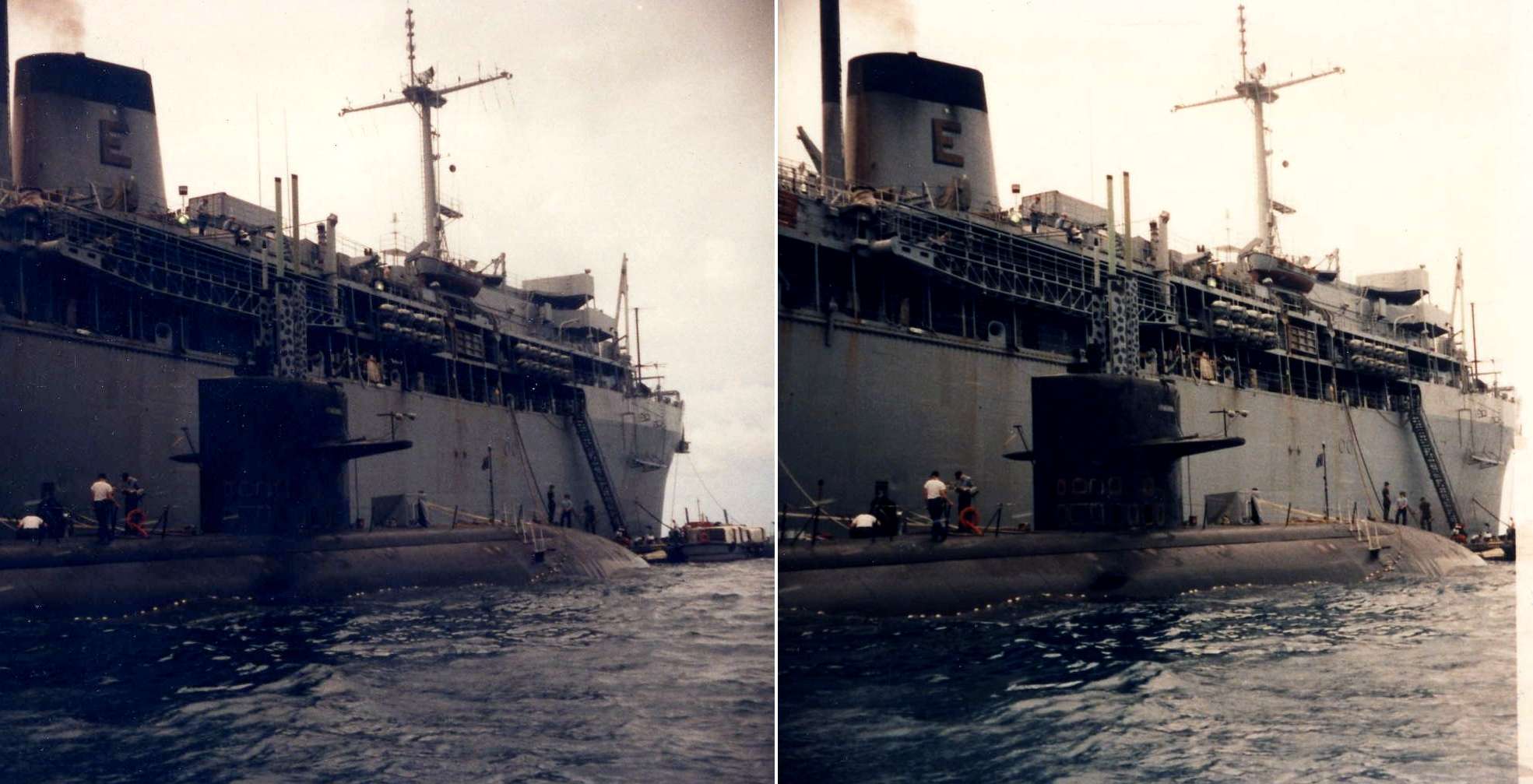 ![]() | 154k | Stereoscopic view of the Boston (SSN-703) moored alongside an unknown sub tender at Diego Garcia, April - August 1983. | Courtesy of Bruce McCausland. | |