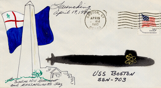 ![]() | 55k | Commemorative postal cover marking the launching of the Boston (SSN-703), at the Electric Boat Division, of General Dynamics Corp., Groton, CT., 19 April 1980. | Courtesy of Jack Treutle (of blessed memory). | |
