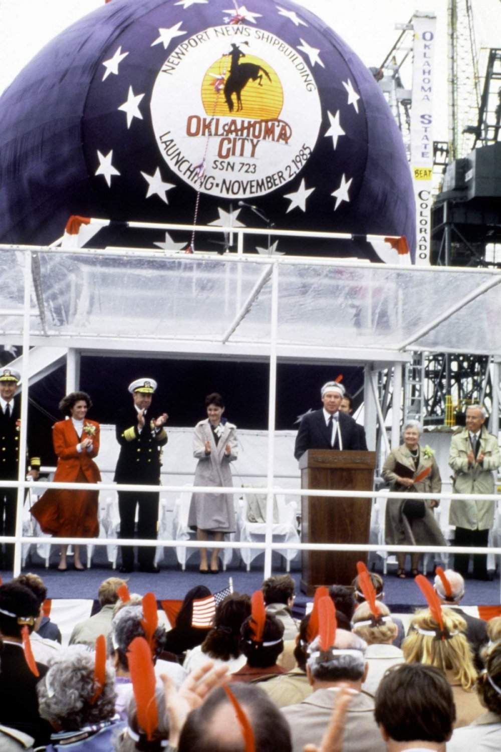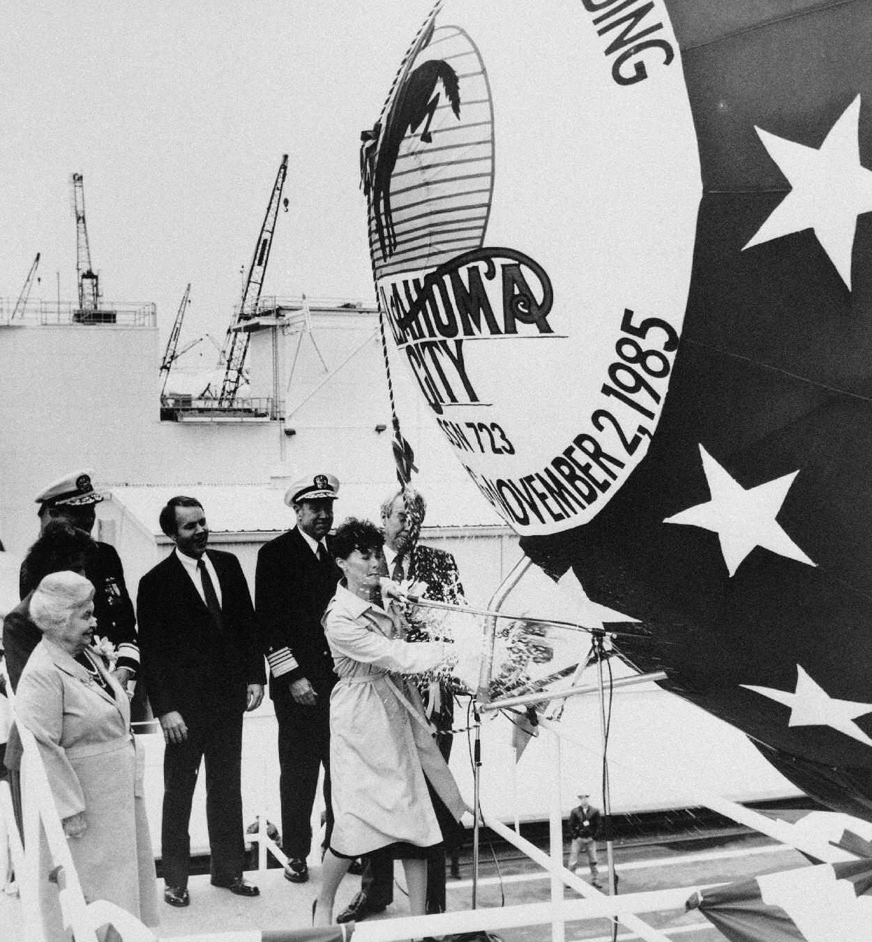 ![]() | 205k | Sponsor Jane Nickles christens the nuclear-powered attack submarine Oklahoma City (SSN-723) on 2 November 1985. Other members of the launching party include, from left to right: Eleanor Kirkpatrick, matron of honor; Senator Don Nickles, Republican-Oklahoma; Admiral (ADM) William J. Crowe Jr., chairman of the joint chiefs of staff; and Edward J. Campbell, president of Newport News Shipbuilding. | Official USN photo # DN-SN-86-10630 by Chris Oxley, from the Department of Defense Still Media Collection, courtesy of dodmedia.osd.mil. | |