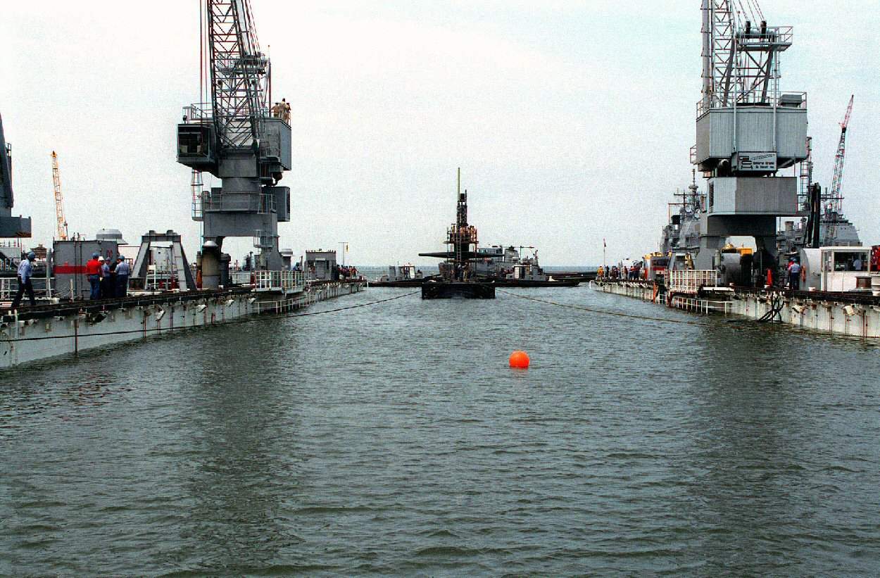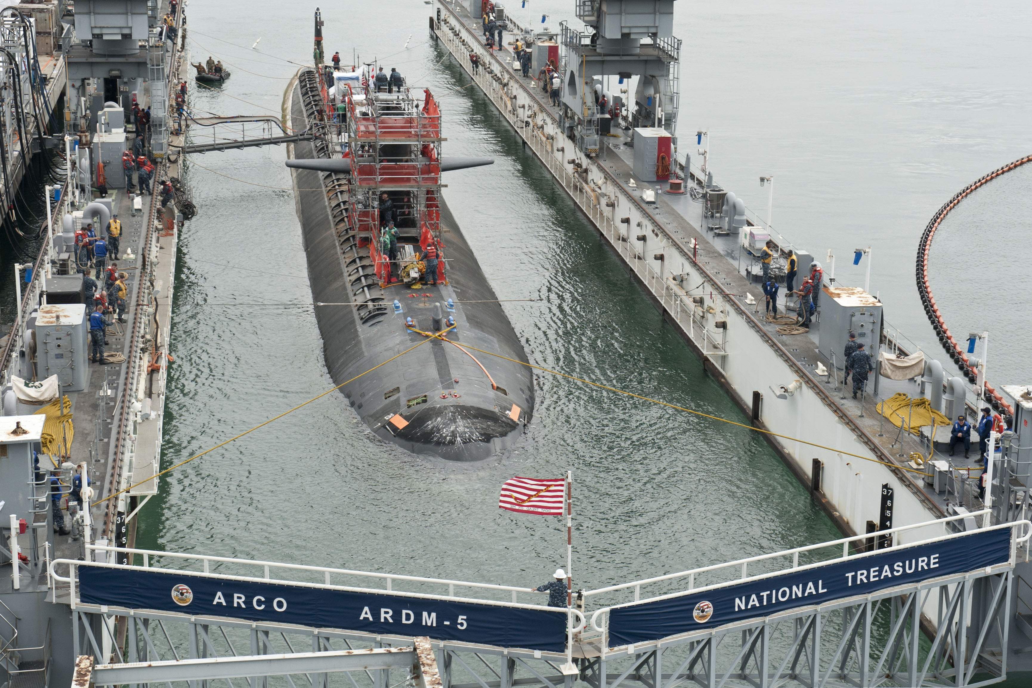 ![]() | 1.09k | The fast attack submarine Oklahoma City (SSN-723), assigned to Commander, Submarine Squadron 15, enters the floating dry dock Arco (ARDM-5) on 5 May 2016 for a scheduled maintenance period. Arco is a Commander, Submarine Squadron 11 asset under the operational control of Commander, Submarine Force, U.S. Pacific Fleet. | USN photo # 160505-N-TW634-039 Mass Communication Specialist 3rd Class Derek A. Harkins, courtesy of news.navy.mil. | |
