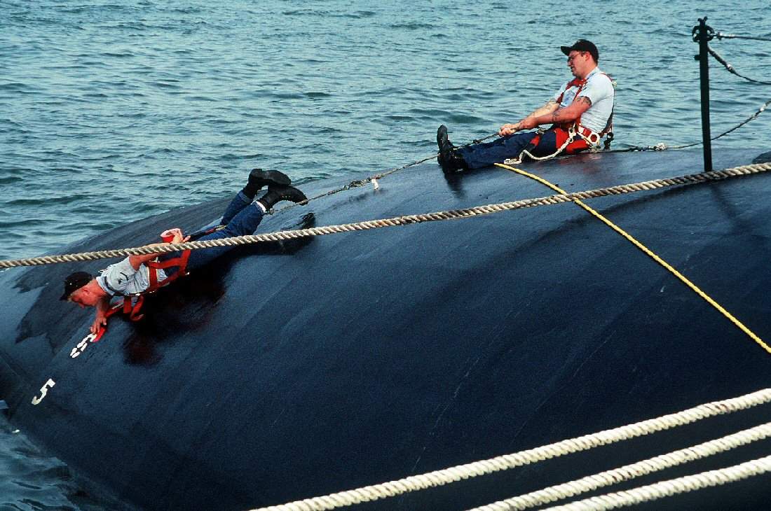 ![]() | 121k | Crewmen of the nuclear-powered attack submarine Oklahoma City (SSN-723) touch up the depth indicator numbers on the bow of their sub while moored at the destroyer and submarine (D&S) piers at NAS Norfolk on 1 January 1997. Note the safety lines to protect the crew while working on the slick deck. | Official USN photo # DN-ST-97-00720 by PH1 Michael Flynn, USN, from the Department of Defense Still Media Collection, courtesy of dodmedia.osd.mil. | |