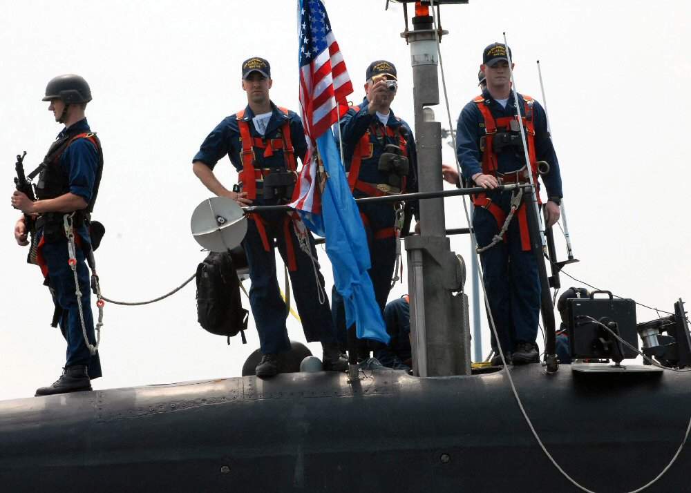 ![]() | 412k | The crew of the fast-attack submarine Oklahoma City (SSN-723) salutes the Ensign as they depart for a deployment on 9 May 2008. Cmdr. Ed Mayer IV, commanding officer of Oklahoma City, will lead the crew in operations supporting national security and contributing directly to the maritime strategy. This deployment will be Oklahoma City's second using the Voyage Management System, a paperless navigation system that uses digital charts, GPS fixes, environmental sensors and electronic command and control. The system helps the submarine locate and identify potential navigational hazards, allowing for a smooth, safe deployment. | USN photo # N-7668G-149, by Electrician's Mate 2nd Class Xander Gamble courtesy of news.navy.mil. | |