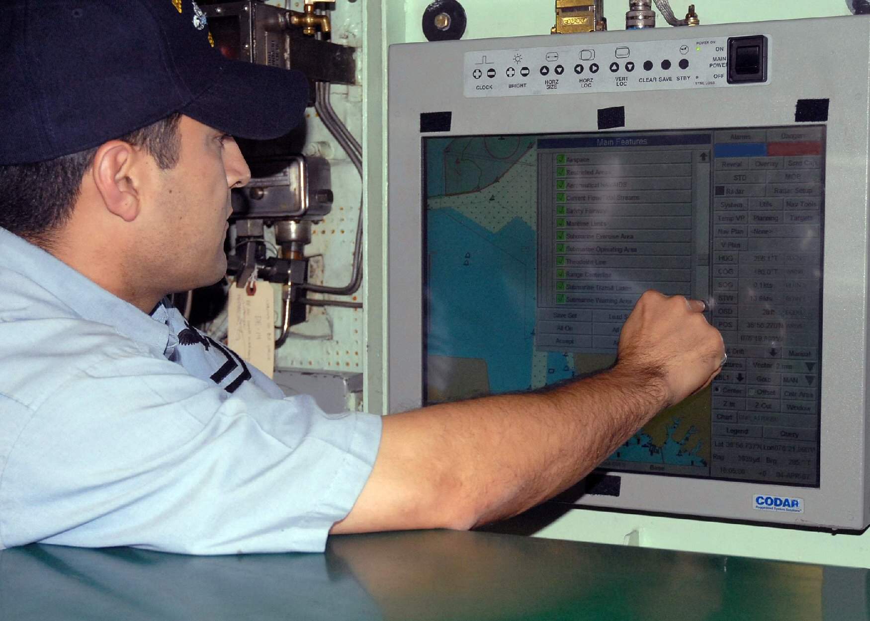 ![]() | 177k | A Sailor aboard the Oklahoma City (SSN-723) familiarizes himself with the Voyage Management System (VMS)on 6 April 2007. VMS is a combination of digital charts, constant global positioning system fixes, environmental sensors and electronic command and control to allow the submarine to eliminate many of the constraining aspects of navigation when using paper charts. | Official USN photo # N-8655E-001 by Mass Communication Specialist Seaman Kelvin Edwards, courtesy of news.navy.mil. Photo submitted by Bill Gonyo. | |