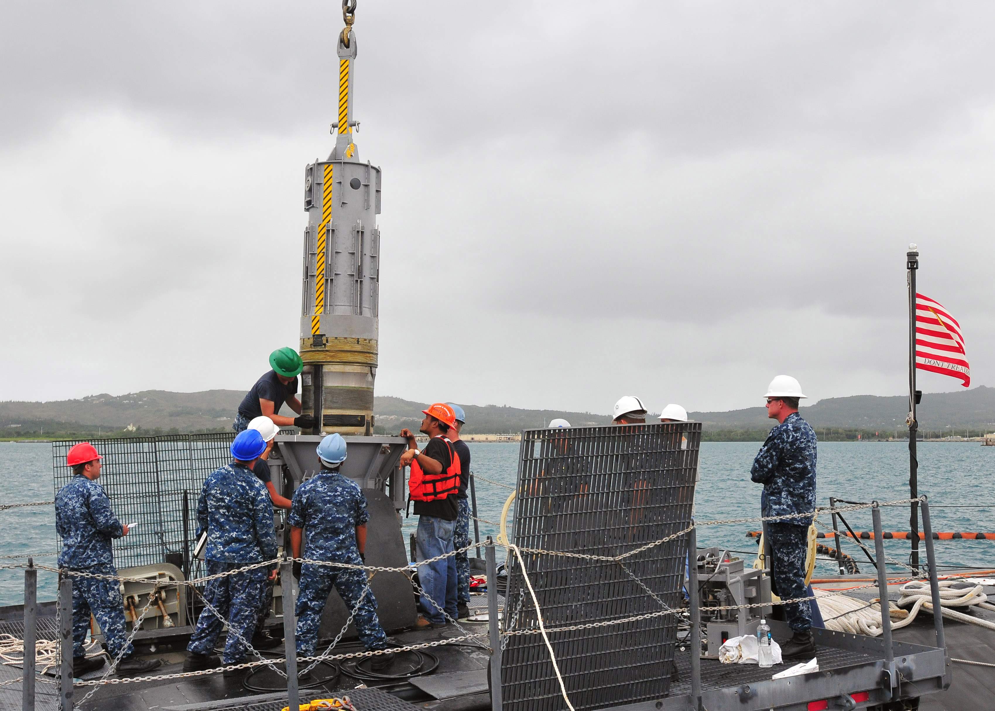 ![]() | 357k | Sailors assigned to the attack submarine Oklahoma City (SSN-723) participate in crane operations conducted by civil service mariners aboard the submarine tender Frank Cable (AS-40) in preparation for getting underway, 26 October 2012. | USN photo # N-BK435-070 by Mass Communication Specialist 2nd Class Jeremy M. Starr, courtesy of news.navy.mil. | |