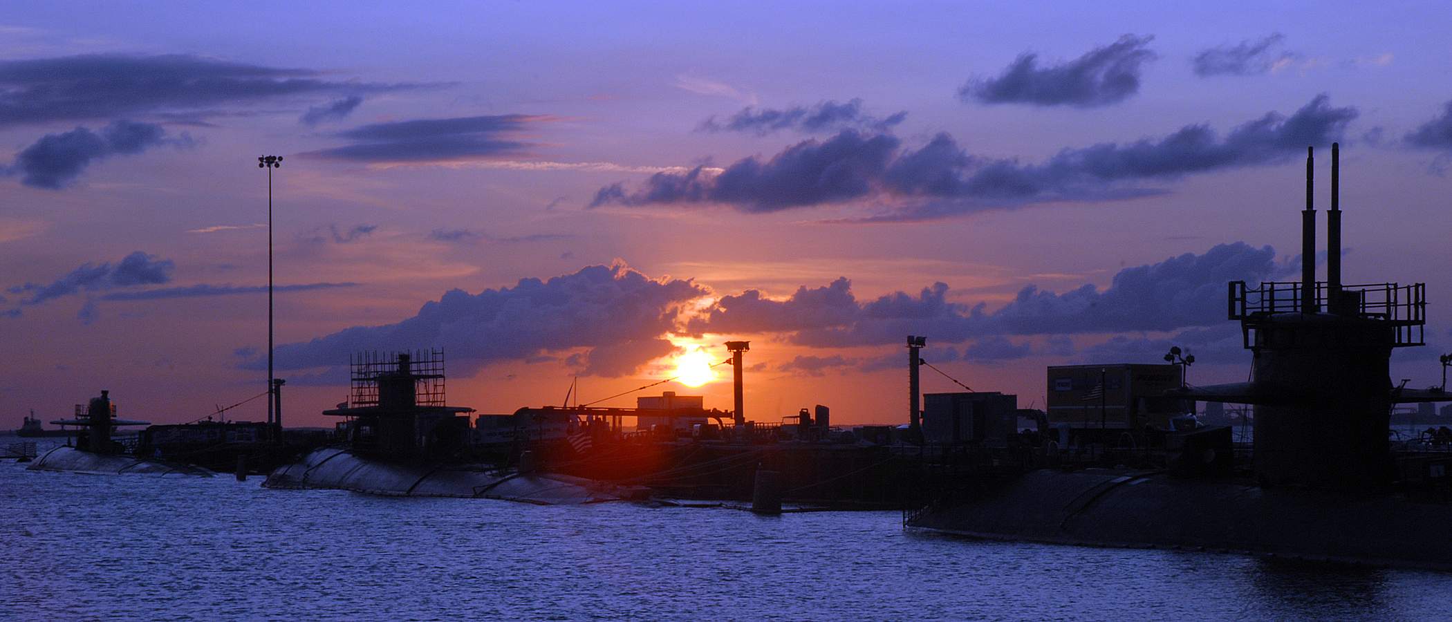 ![]() | 150k | The fast-attack submarines Norfolk (SSN-714), left, Newport News (SSN-750) and Oklahoma City (SSN-723) sit moored at Naval Station Norfolk's Pier 3 during sunset on 22 August 2008. | USN photo # N-7668G-004 by Mass Communication Specialist 2nd Class Xander Gamble, courtesy of news.navy.mil. | |