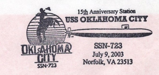 ![]() | 43k | A Fancy illustrated pictorial cancellation authorized by USPS for ONE DAY ONLY USE at event site for historical navy postal mementoes. This is a commemorative postal cover issued on the occasion of fifteen years that the Oklahoma City (SSN-723) has been on station at Norfolk, VA., 9 July 2003. | Courtesy of Jack Treutle (of blessed memory). | |
