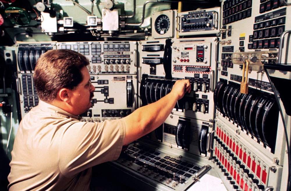 ![]() | 106k | A Chief Petty Officer at the main control center on board the nuclear-powered attack submarine Oklahoma City (SSN-723) is ready to make instant course changes during an at sea period in the Atlantic Ocean, September 1991. | USN photo # CI-95-00042-KT / N-9999X-447, courtesy of COMSUBPAC. | |