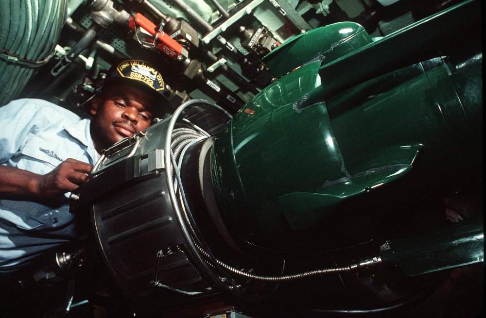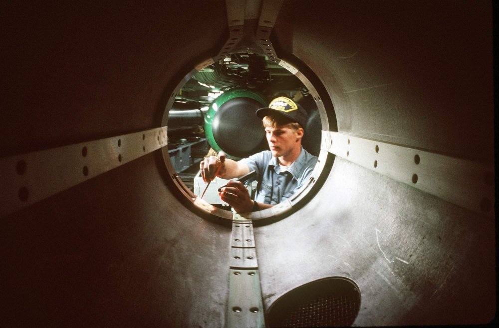 ![]() | 93k | A crew member performs routine maintenance on a torpedo tube aboard the nuclear-powered attack submarine Oklahoma City (SSN-723) on 1 September 1991. | Official USN photo # DN-ST-94-00576 by PH1 Mike Flynn, from the Department of Defense Still Media Collection, courtesy of dodmedia.osd.mil. | |