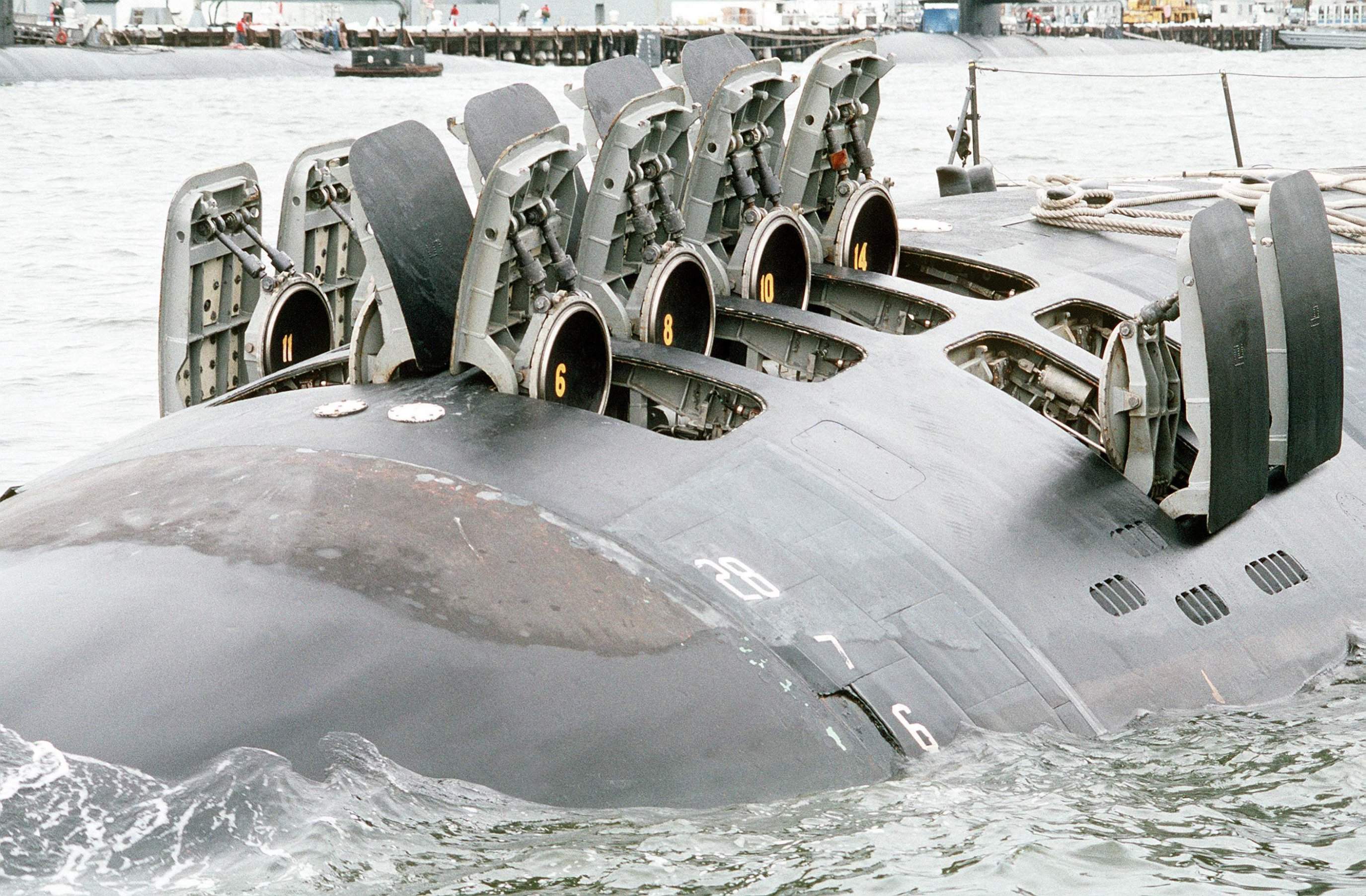 ![]() | 279k | A view of four of the 12 vertical-launch Tomahawk missile tubes on the bow of the nuclear-powered attack submarine Oklahoma City (SSN-723) on 1 February 1991. | Official USN photo # DN-ST-91-05257 by PH1 Robert Mcroy, from the Department of Defense Still Media Collection, courtesy of dodmedia.osd.mil. | |