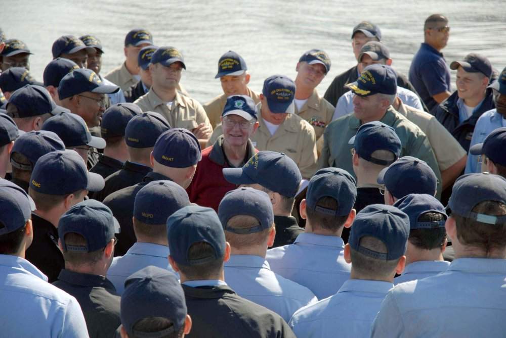 ![]() | 73k | Submarine Veteran F. Neal Sever talks to the crew of the attack submarine Oklahoma City (SSN-723) during his visit at Norfolk, Va. 13 October 2006. Following his tour, Sever attended the time honored dolphin pinning ceremony and gave a first hand account of the only ground combat operation on Japanese territory in World War II. Sever's accomplishments were immortalized in the nonfiction novel "Thunder Below" by Commander Eugene "Lucky" Fluckey. | USN photo # N-5268S-001, by USN photo by Mass Communication Specialist 1st Class Christina M. Shaw, courtesy of news.navy.mil. | |