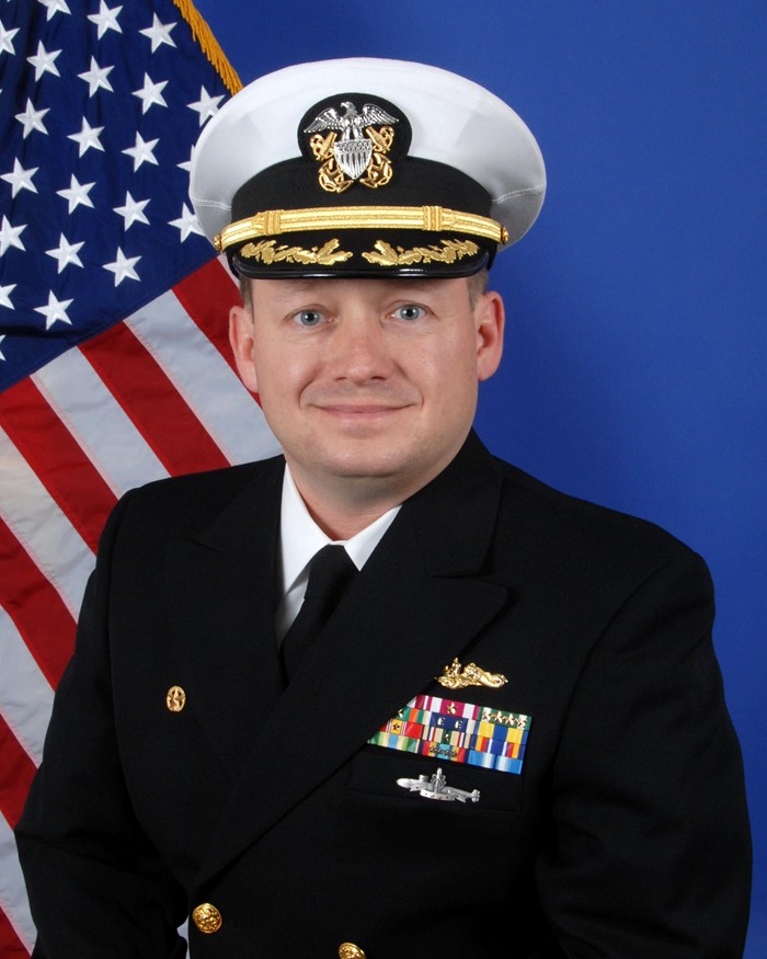 | 119k | Commander James Edward Crosley graduated from Virginia Tech in 1990, earning a Bachelor of Science degree in Physics. After commissioning at Officer Candidate School in Newport, Rhode Island and completion of the submarine officer training pipeline, he reported to his initial sea duty assignment, the Miami (SSN-755) in 1992. His first Department Head tour began in September of 1998 as Engineer on the James K. Polk (SSN-645). Commander Crosley joined the James K. Polk on her last deployment and completed his tour through the ship's decommissioning in July of 1999. He then reported to the Albany (SSN-753) in Norfolk, Virginia as the Navigation and Operations Department Head. On the Albany he completed his third Mediterranean deployment, this time with the George Washington Battle Group. From May, 2004 to February, 2006, LCDR Crosley served as Executive Officer on the Nevada (SSBN-733) (BLUE). While assigned, the Nevada completed three strategic deterrent patrols and earned the Submarine Squadron Nineteen Battle “E” for 2005. Commander Crosley assumed command of the Alabama (SSBN-731)(Gold) in October 2008. | Official U.S. Navy portrait courtesy of Bill Gonyo. |