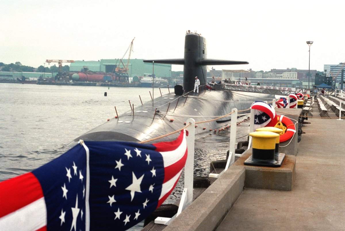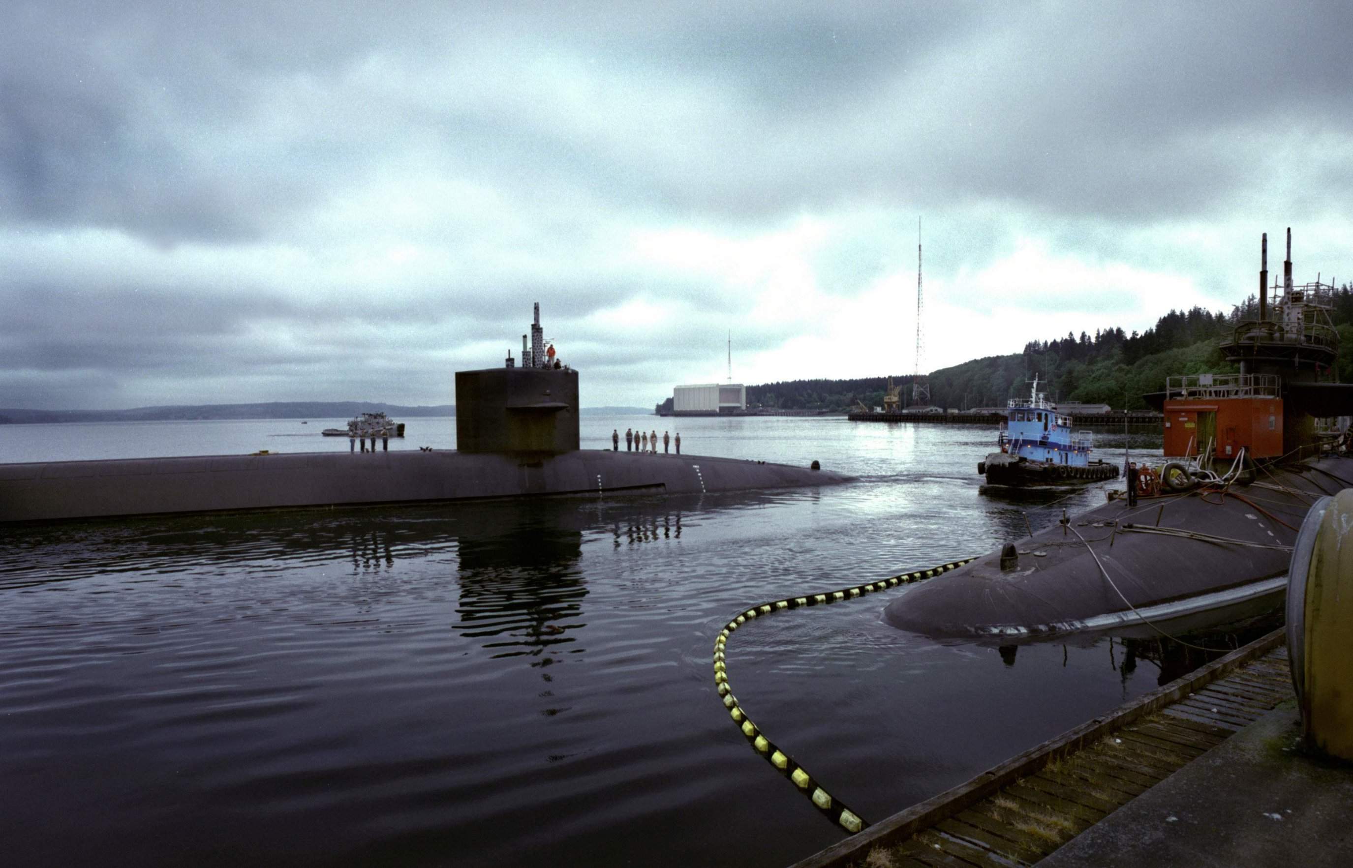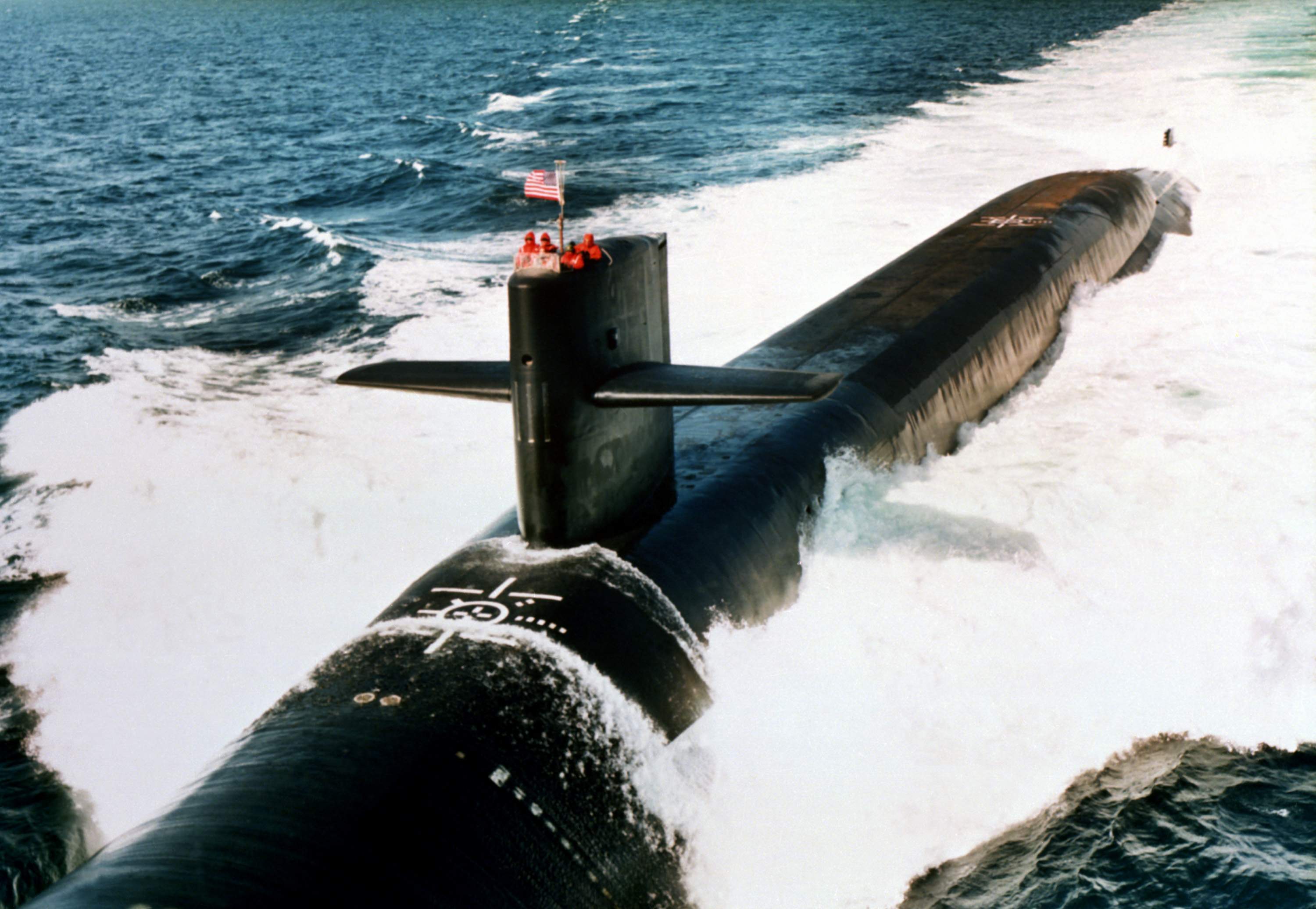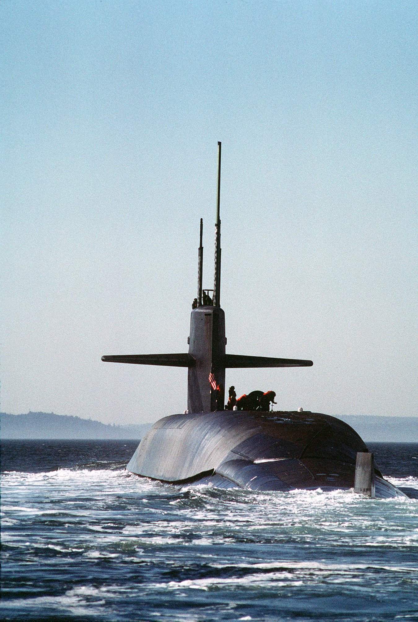 | 359k | Crewmen stand on the deck of the nuclear-powered strategic missile submarine Alabama (SSBN-731), as the vessel returns to port after completing the 100th Trident ballistic missile submarine patrol at Bangor, Washington.