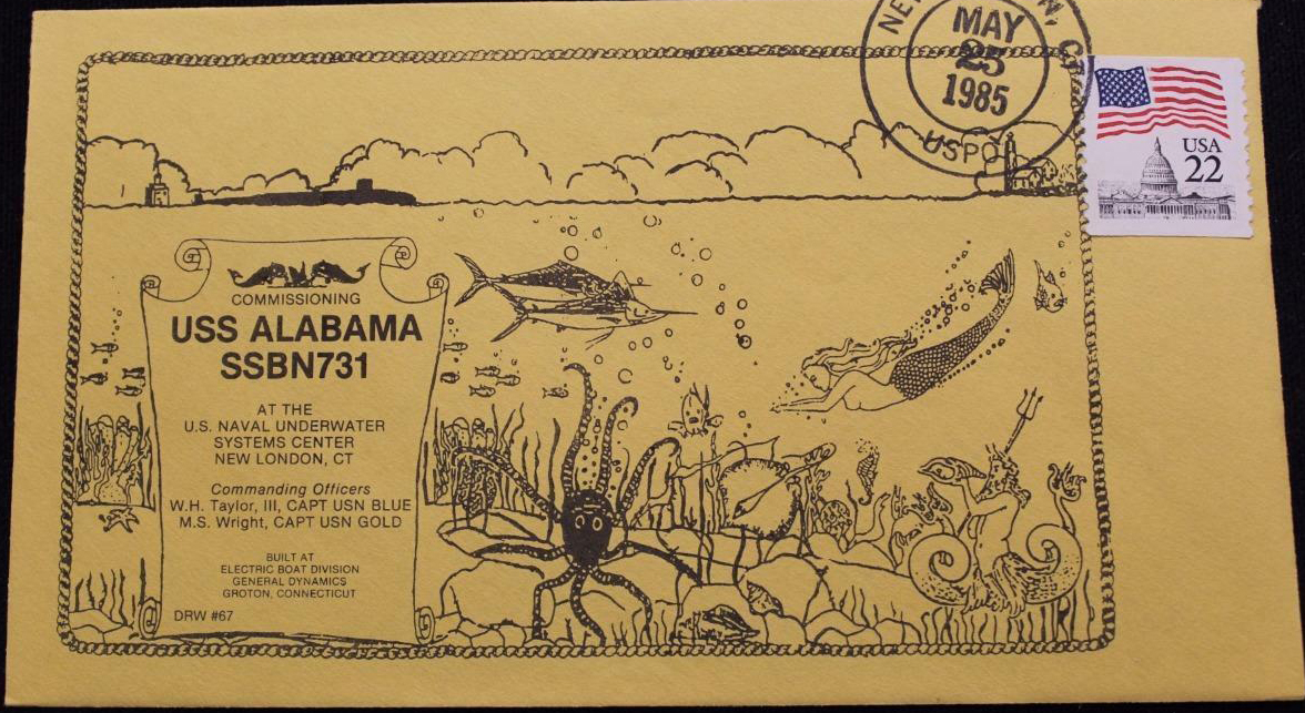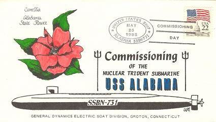 | 55k | Commemorative post mark on the occasion of Alabama's (SSBN-731) commissioning, 25 May 1985. | Courtesy of Jack Treutle (of blessed memory). |