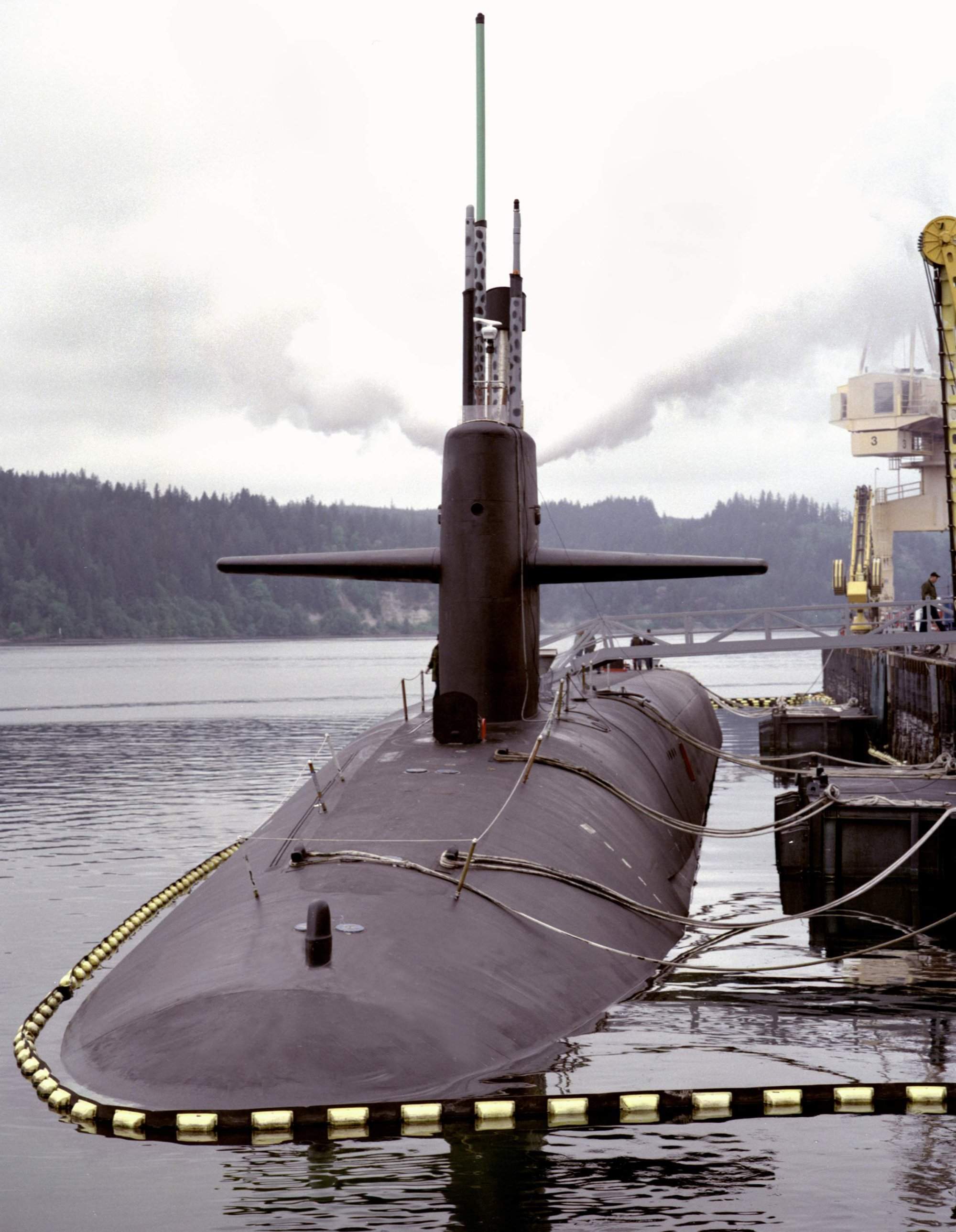 | 492k | Bows on view of the ballistic missile submarine Alabama (SSBN-731), as she moves to the Explosives Handling Wharf as the crew stands at attention for the raising of the colors, 7 May 1998. | USN photo # N-6497N-002, by Brian Nokell courtesy of the US Navy Chinfo Photo Gallery. |
