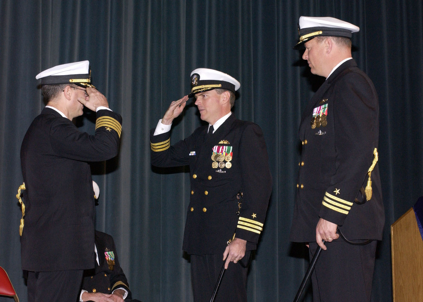 | 450k | Cmdr. Jonathan Dowell, center, out going commanding officer of the Alabama (SSBN-731) (G), salutes Capt. Robert E. Schuetz, (left), commodore of Commander Submarine Squadron 17, as Cmdr. Melvin Lee, (right), stands by to report as the new commanding officer of the Alabama (G) during the change of command ceremony at the Naval Undersea Warfare Museum on 21 November 2003.