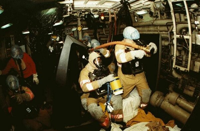 | 95k | Submarine firefighting, personal protection equipment drill (PPE) aboard the Alabama (SSBN-731), date unknown. | USN photo courtesy of (Naval Sea Systems Command) dcfp.navy.mil. |