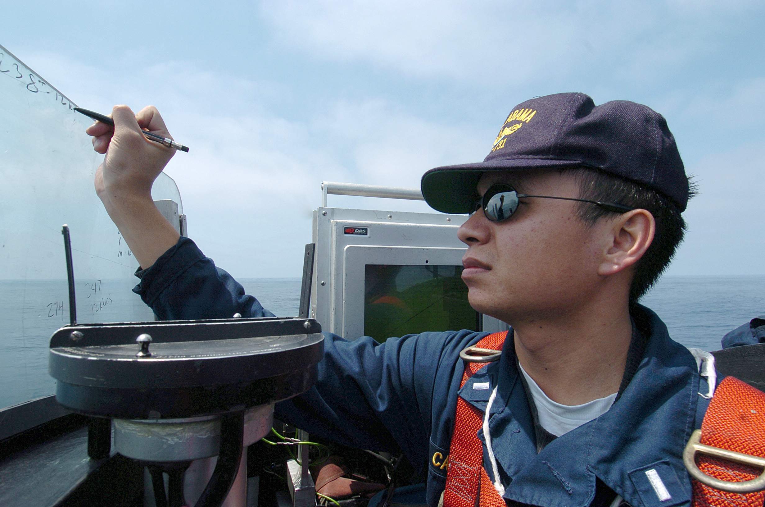 | 329k | Officer of the Deck Lt.j.g. Neil Cayabyab logs the current heading of the Ohio-class fleet ballistic missile submarine Alabama (SSBN-731) using a grease pencil on the bridge windscreen, 19 July 2005. Alabama is conducting operations off the coast of Southern California in support of the summer Career Orientation and Training for Midshipmen (CORTRAMID) program. | USN photo # N-7949W-001 by Photographer's Mate 1st Class Daniel N. Woods, courtesy of news.navy.mil. & Jack Treutle (of blessed memory). |