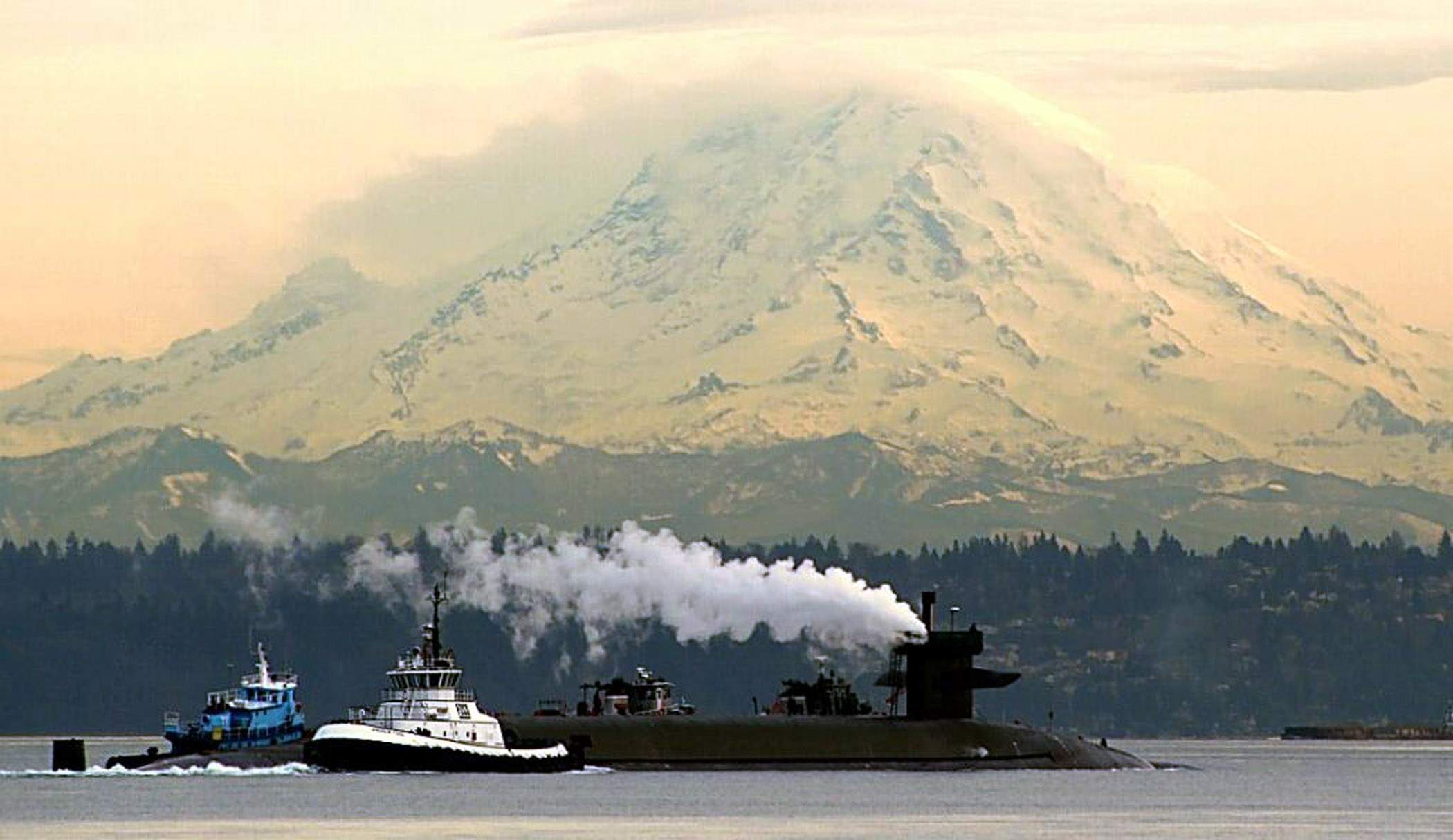 | 161k | The Ohio-class nuclear powered ballistic missile submarine Alabama (SSBN-731) is being moved "dead-stick" in the sound by a flotilla of tug boats with Mount Rainer in background near Puget Sound, Wash. 4 January 2006. | USN photo # N-0000M-001 by Mr. Anthony Madina, courtesy of news.navy.mil. |