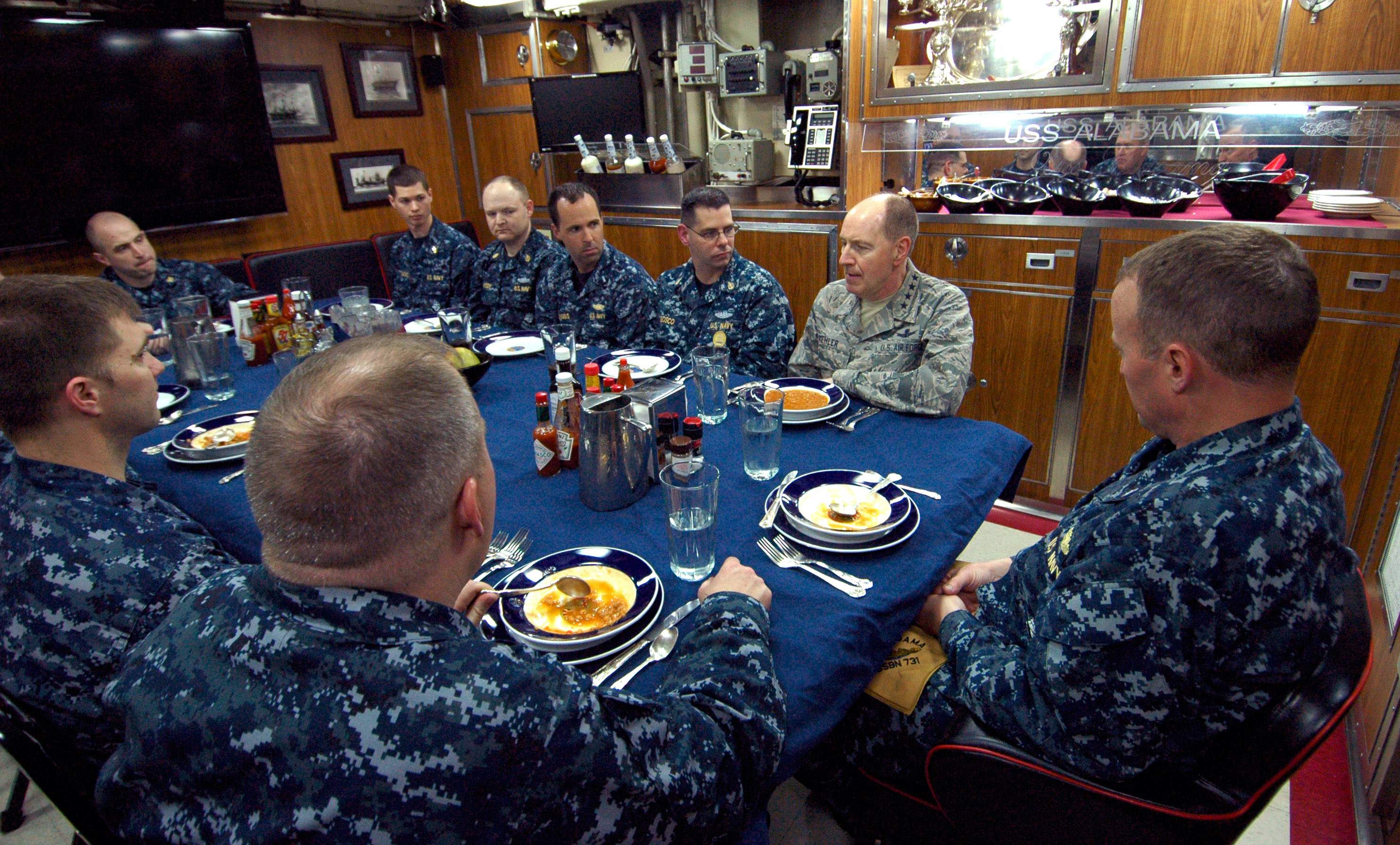 | 784k | Gen. Bob Kehler, commander of U.S. Strategic Command (USSTRATCOM), eats lunch with officers and senior enlisted personnel from the Blue crew of the ballistic missile submarine Alabama (SSBN-731) during a visit to Naval Base Kitsap-Bangor on 12 April 2013. | USN photo 130412-N-GU530-040 by Lt. Ed Early |
