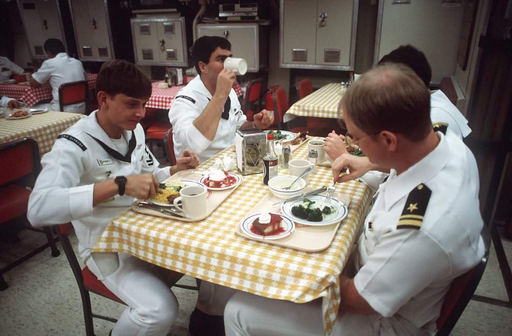 | 74k | An officer and three enlisted men share a table on the mess deck of the nuclear-powered ballistic missile submarine Alabama (SSBN-731) during the 100th Trident ballistic missile submarine patrol on 1 September 1988.