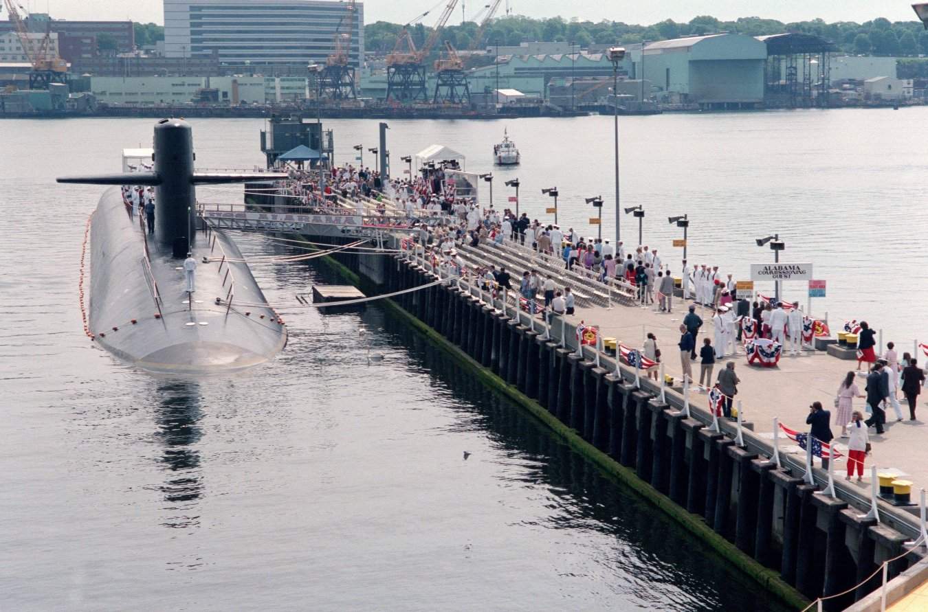 | 74k | An overall view of the ship and the pier during the commissioning ceremony for the nuclear-powered strategic missile submarine Alabama (SSBN-731).