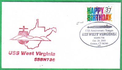 ![]() | 18k | Commemorative post mark on the 15th year of the commissioning of the West Virginia (SSBN-736), 20 October 2005. | Courtesy of Jack Treutle (of blessed memory). | |