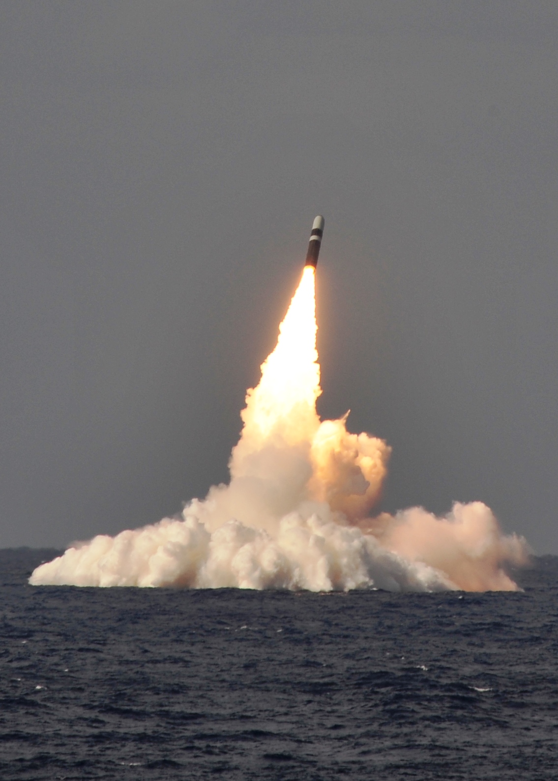 ![]() | 605k | A trident II D-5 ballistic missile is launched from the West Virginia (SSBN-736) during a missile test at the Atlantic Missile Range, 2 June 2014. The test flights were part of a demonstration and shakedown operation, which the Navy uses to certify a submarine for deployment after a major overhaul. The missiles were converted into test configurations with kits containing range safety devices and flight telemetry instrumentation. | US Navy photo # 140602-N-ZZ999-203 courtesy of news.navy.mil. | |