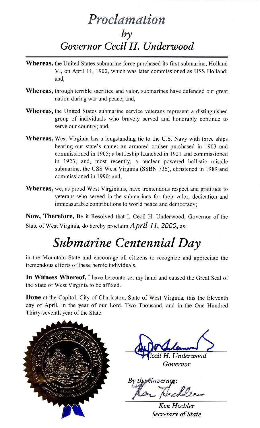 ![]() | 39k | Submarine Centennial Day Proclaimation, 11 April 2000, signed by the Governor of the State of West Virginia in honoring the State's namesake, West Virginia (SSBN-736). | USN photo courtesy of chinfo.navy.mil. submitted by Bill Gonyo. | |