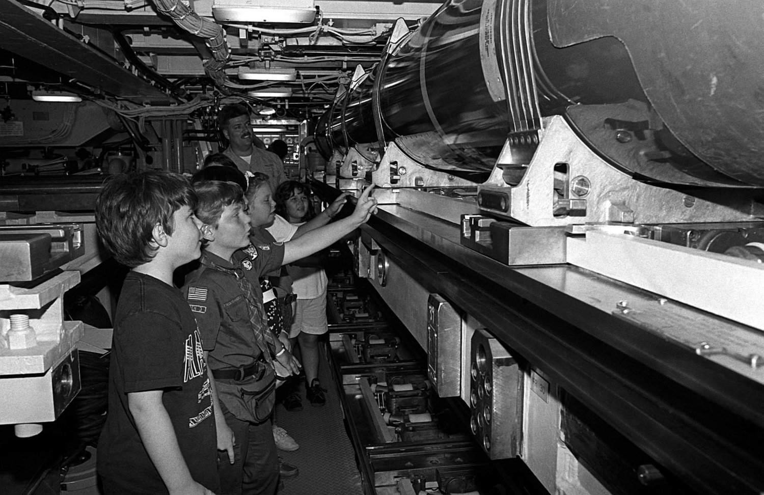 ![]() | 170k | Students explore the torpedo room aboard the nuclear-powered strategic missile submarine West Virginia (SSBN-736) during their hour-long tour of the vessel on 18 September 1991. The children are fourth and fifth grade honor students at Matilda Harris Elementary School. | USN photo # DN-SN-92-04150, by Julie Irwin, from the Department of Defense Still Media Collection, courtesy of dodmedia.osd.mil. | |