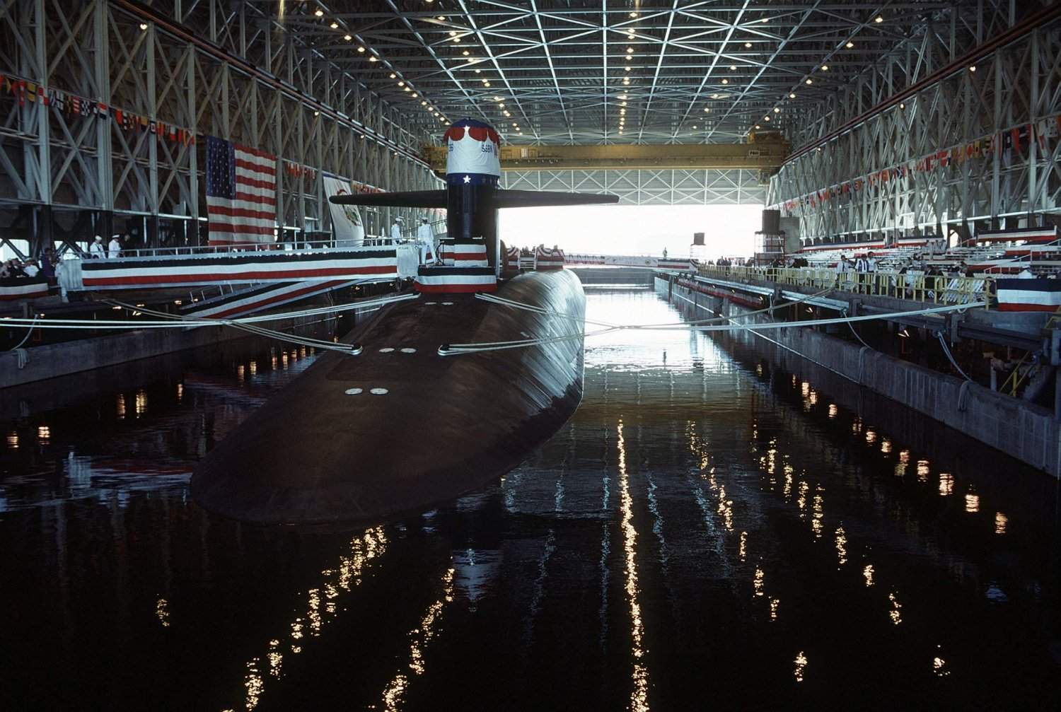 ![]() | 182k | The nuclear-powered fleet ballistic missile submarine West Virginia (SSBN-736) lies in a covered dry dock on the day of its commissioning ceremony at Kings Bay, Georgia on 2 October 1990. | USN photo # DN-ST-91-01585, by PH3 Hughes-Smith, from the Department of Defense Still Media Collection, courtesy of dodmedia.osd.mil. | |