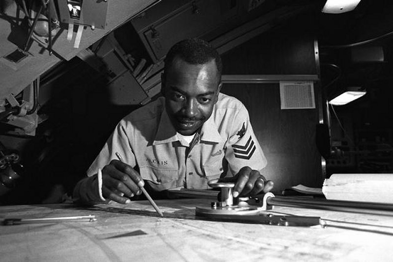 ![]() | 67k | Quartermaster First Class (QM1) Alexis, on board the nuclear-powered ballistic missile submarine West Virginia (SSBN-736), carefully plots a course as the ship departs the Naval Submarine Base Kings Bay, Georgia on 1 June 1995. | USN photo # DN-SN-96-00024, by Julie Irwin, from the Department of Defense Still Media Collection, courtesy of dodmedia.osd.mil. | |