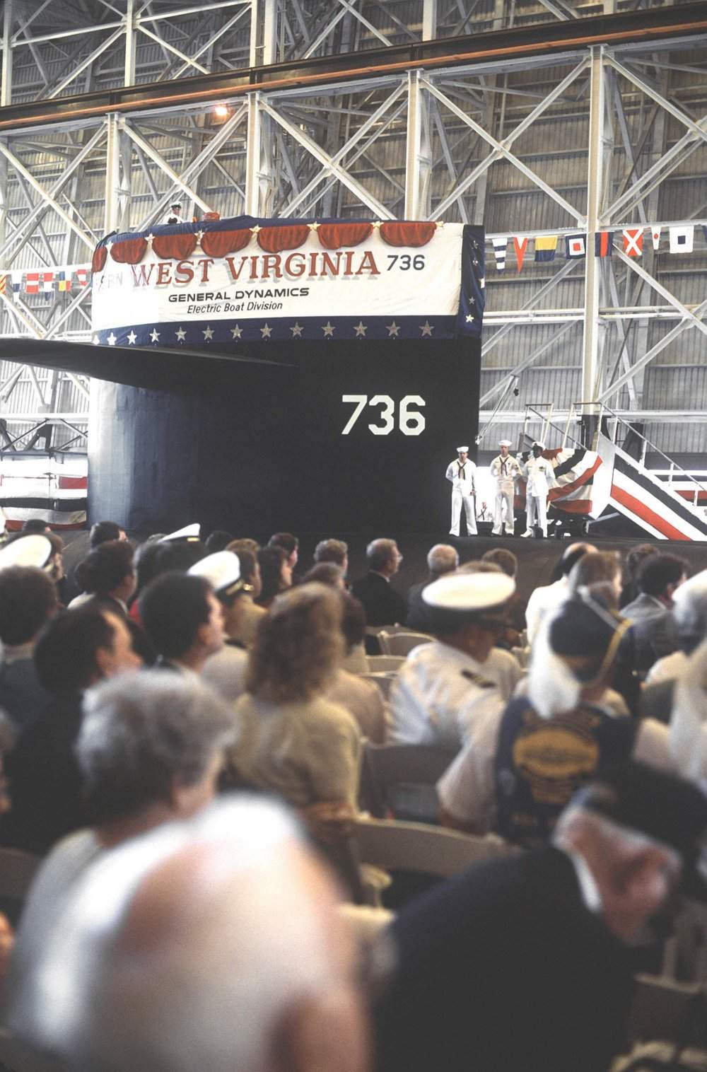 ![]() | 167k | Stern view of the nuclear-powered fleet ballistic missile submarine West Virginia (SSBN-736) as it lies in a covered dry dock on the day of its commissioning ceremony. | USN photo # DN-ST-91-01584, by PH3 Hughes-Smith, from the Department of Defense Still Media Collection, courtesy of dodmedia.osd.mil. | |