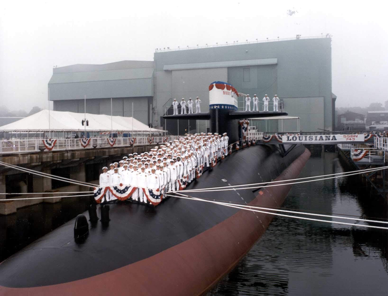 | 130k | The crew of Ohio Class Fleet Ballistic Missile Submarine Louisiana (SSBN-743) line the deck during her commissioning on 6 September 1997.