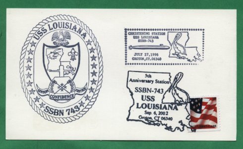 | 35k | Commemorative postal cover issued on the occasion of the Louisiana's (SSBN-743) 5th year of commissioning, 6 September 2002. | Courtesy of Electric Boat Division of General Dynamics Corp. |