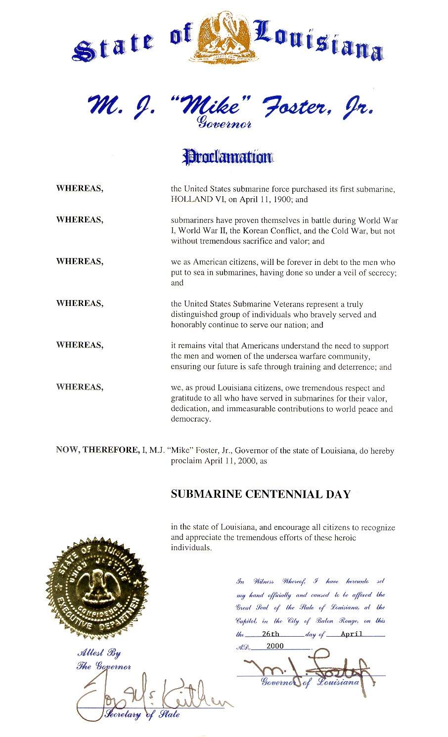 | 148k | Submarine Centennial Day Proclamation, 26 April 2000, signed by the Governor of the State of Louisiana in honoring the State's namesake, Louisiana (SSBN-743). | USN photo courtesy of chinfo.navy.mil., submitted by Bill Gonyo. |