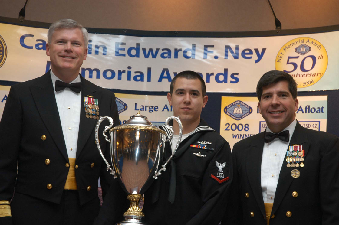 | 131k | In commemoration of the 50th anniversary of the Ney Program, a luncheon hosted by the International Food Service Executive Association was held on Saturday afternoon 5 Apr, 2008, at the Adams Mark Hotel, Denver Colorado for all Navy personnel. The NEY Awards Program as part of the Joint Services Ceremony and Banquet and was held on Saturday evening, which also included a 50th anniversary cake ceremony sponsored by IFSEA. Louisiana (SSBN-743) (Blue) received first place for the submarine category. Established in 1958 by the Secretary of the Navy and the International Food Service Executives Association (IFSEA) to improve and recognize the quality of food service in the Navy. Named in honor of Captain Edward F. Ney, Supply Corps, United States Navy, Head of the Subsistence Division of the Bureau of Supplies and Accounts from 1940 to 1945. Captain Ney contributed to the high morale, comfort and well-being of officers and men in the United States Navy.