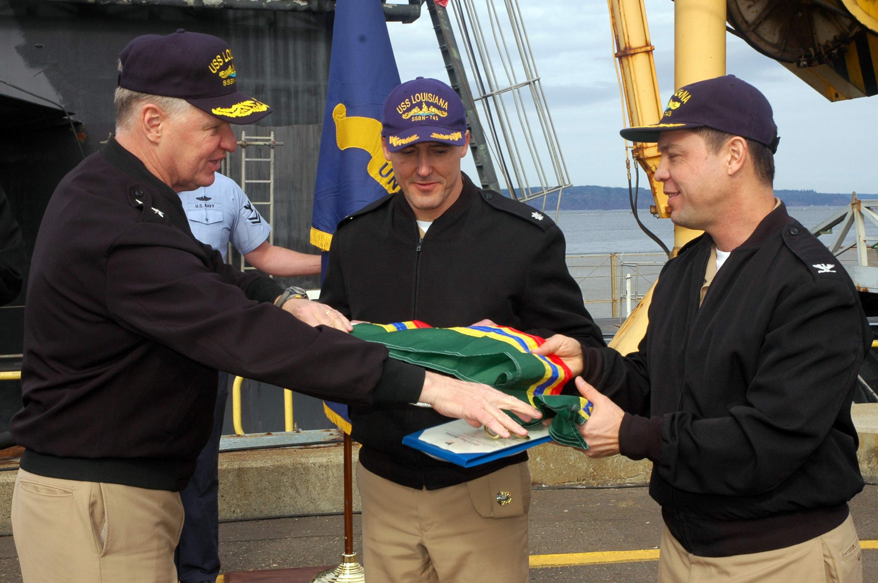 | 419k | Chief of Naval Operations (CNO) Adm. Gary Roughead, left, presents a Meritorious Unit Commendation flag to ballistic missile submarine Louisiana (SSBN-743) Blue Team commanding officer Cmdr. Blake Converse and Gold Team commanding officer Capt. Shannon Kawane on 17 February 2009. Louisiana was awarded the Meritorious Unit Commendation medal for demonstrating sustained superior performance while setting fleet standards of excellence in administration, engineering, supply, personnel programs and community support. | USN photo # N-8119A-075 by Mass Communication Specialist Petty Officer 2nd Class Gretchen M. Albrecht courtesy navy.news.mil. & submitted by Bill Gonyo. |