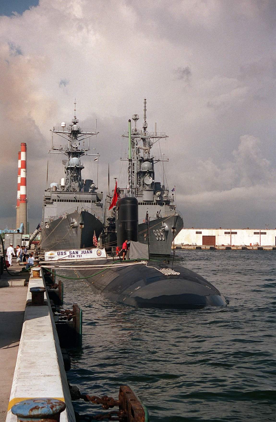 ![]() | 199k | A starboard bow view of the nuclear-powered attack submarine San Juan (SSN-751) tied up to the pier at Port Everglades, FL.,8 October 1994. In the background the destroyers Comte De Grasse (DD-974) and Scott (DDG-995) are also tied up. | USN photo # DN-SC-95-01276 by OS2 John Bouvia, from the Department of Defense Still Media Collection, courtesy of dodmedia.osd.mil & submitted by Bill Gonyo. | |