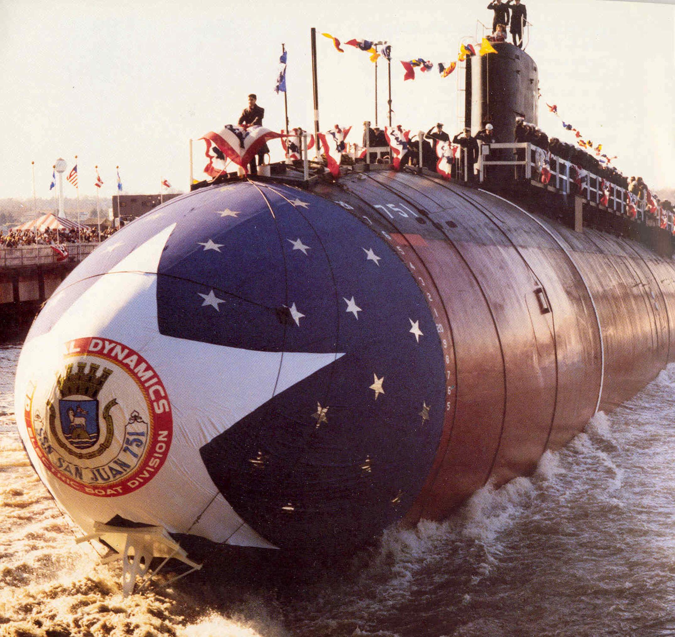 ![]() | 513k | San Juan (SSN-751) is waterbourne after her launching, 6 December 1986. | Photo courtesy of Scott Koen & ussnewyork.com. | |