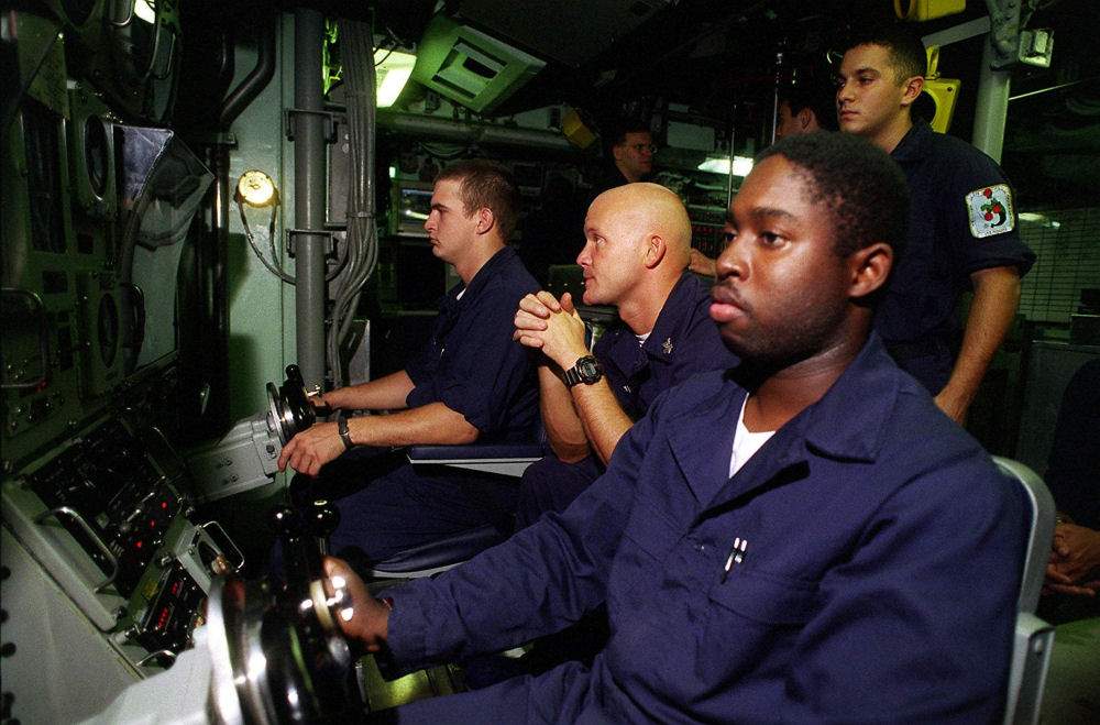![]() | 92k | Crewmembers of the nuclear-powered submarine Pasadena (SSN-752) maintain speed and depth control as they stay vigilant of the sub's controls while transiting under the Hawaiian waters during the RIMPAC '98 on 19 July 1998. | Official USN photo # DN-SD-00-01106, by PH2 August Sigur, from the Department of Defense Still Media Collection, courtesy of dodmedia.osd.mil. | |