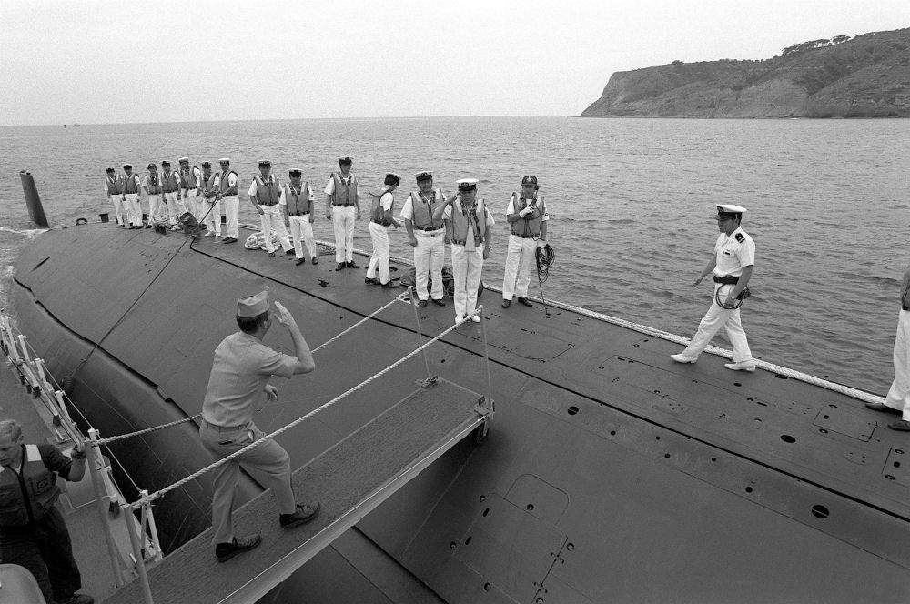 ![]() | 91k | CMDR Dan Thigpen, commanding officer of the nuclear-powered attack submarine Pasadena (SSN-752) salutes CAPT I. Ozua, commanding officer, as he comes aboard the Japanese Maritime Self-Defense Force submarine Mochishio (SS-74) following the vessel's arrival in port to take part in the joint naval exercise RIMPAC '92 on 10 June 1992. | USN photo # DN-SN-93-00159 by PHC Chet King, from the Department of Defense Still Media Collection, courtesy of dodmedia.osd.mil. and submitted by Bill Gonyo. | |